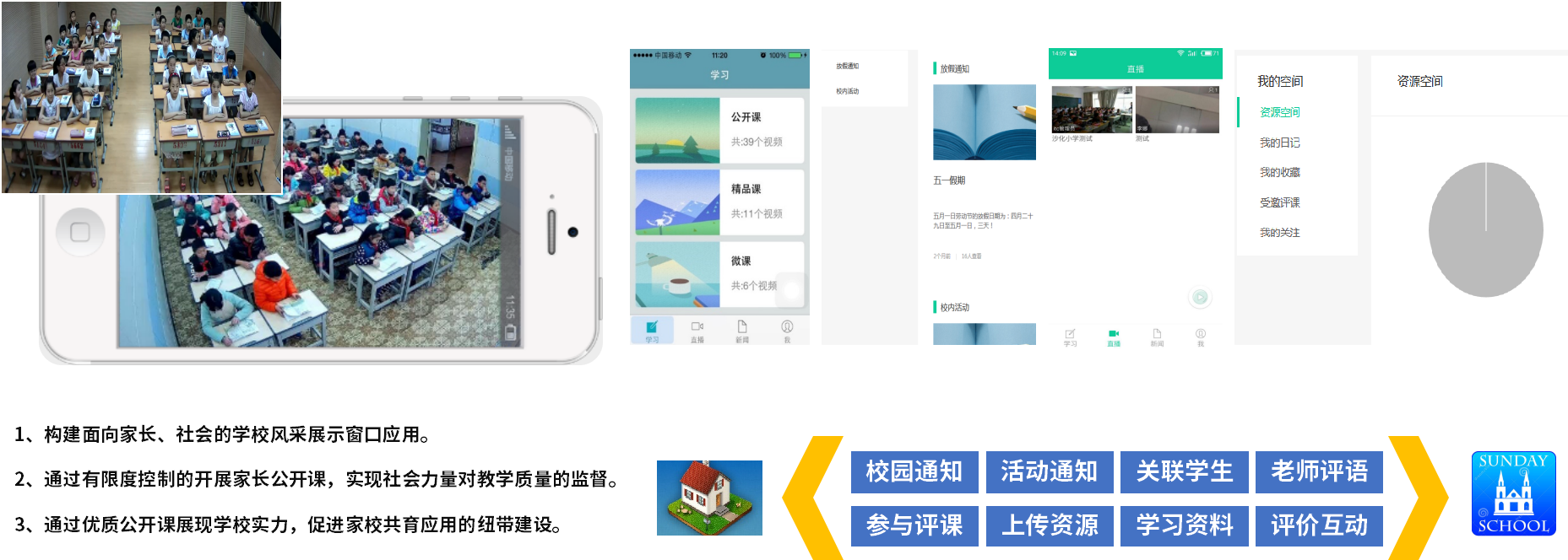 ● 校园风采展示、优质课程展示、家校教学互动、孩子课堂回播,满足学生对个性化发展和高质量教育的需求。